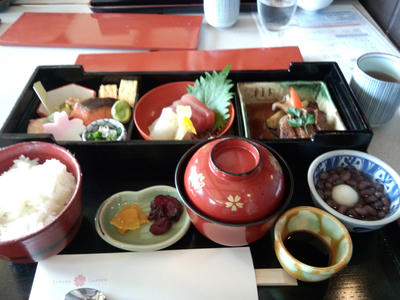 ランチに、お花見弁当とサクラ茶をいただきました。