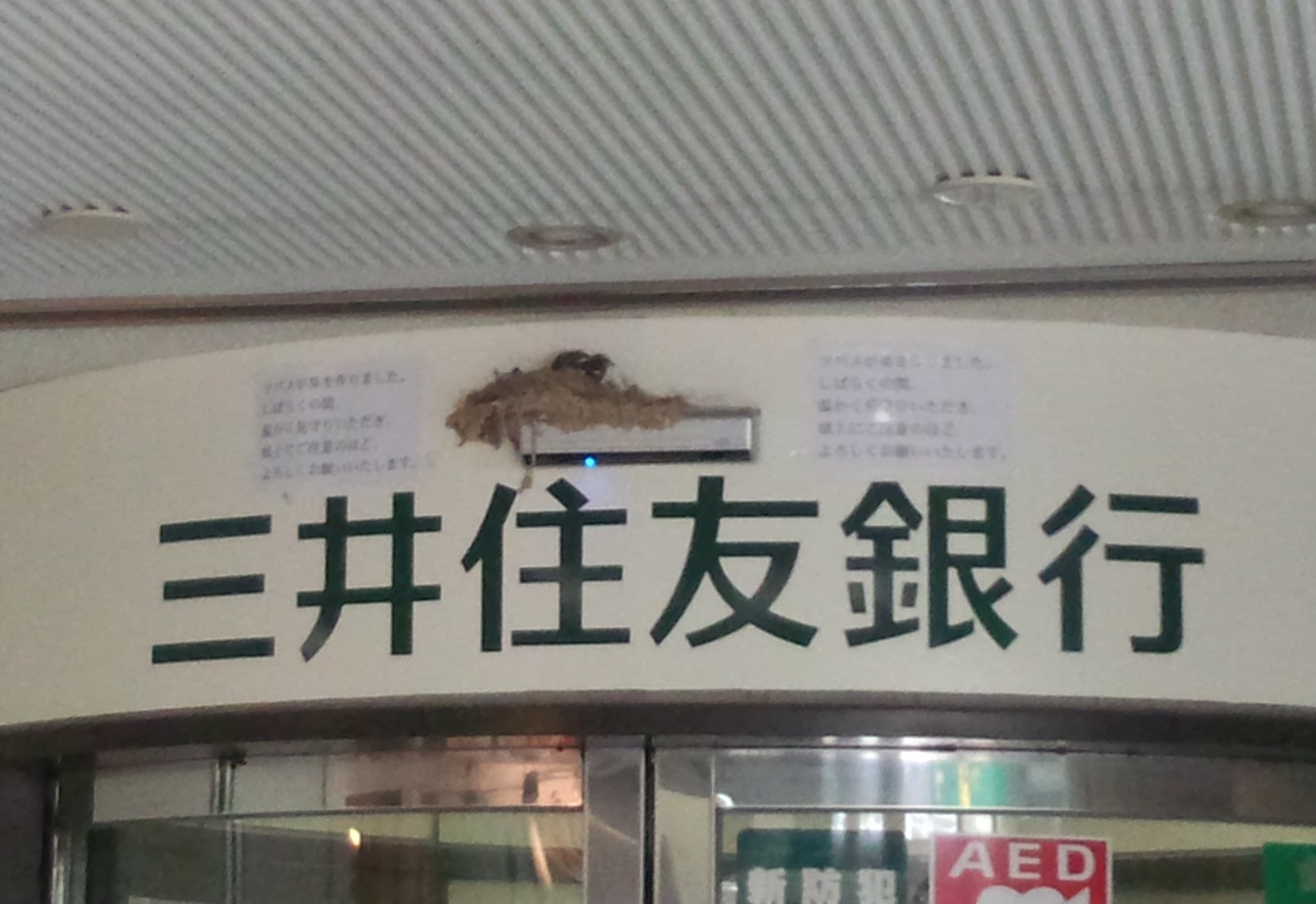 3日ほど前に通りかかったら、成長しすぎて巣から落ちてしまったようで、行員さんがアタフタしておられました。聞くと、前日にも落ちていたそうです(^^;